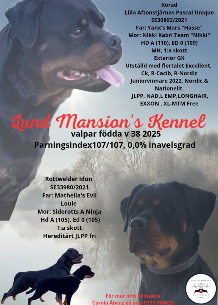 Parningsindex 107/107 Inavelsgrad 0,0% Far: Lilla Aftonstjärnas Pascal Unique Mor: Rottwelder Idun Detta är vad som gäller hos mig. Vi uppfödare har också ett enormt ansvar 🥰 Inga snabba beslut ska ske att skaffa hund, tänk först och ransaka vilken beredskap du har i ett hundägarskap. Det är både arbetsamt och kostsamt men också helt magiskt ❤️ Vid seriöst intresse önskar jag som uppfödare att du skriver till mig och berättar vem du är, hur hunden kommer leva sitt liv med dig, vad ni har för planer tillsammans och vad du förväntar dig av en ny vän och mig som uppfödare. Om det du har att erbjuda känns tillfredställande för mig och min valp/, så sätts du/ni upp på listan för besök och går vidare till nästa steg.